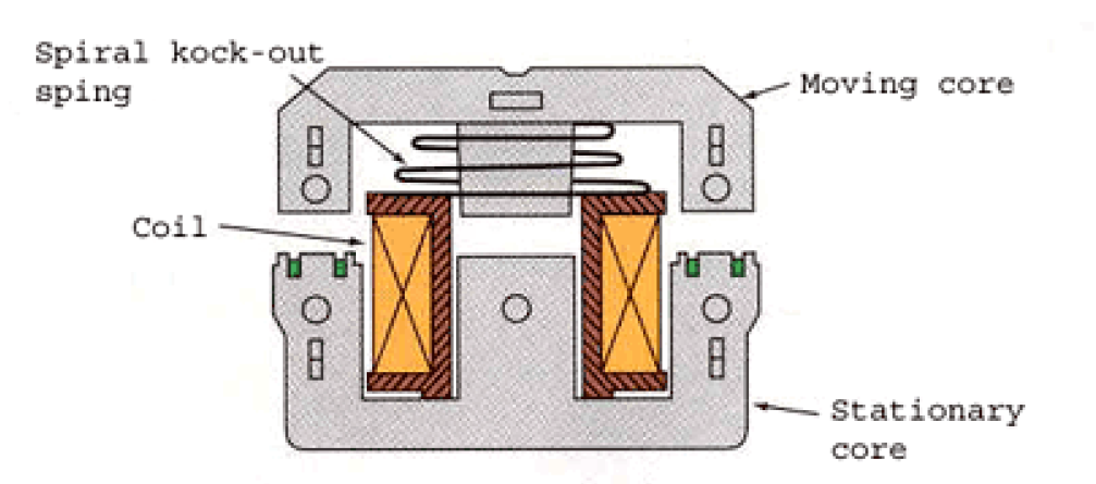 2. แกนเหล็กเคลื่อนที่ (Stationary Core) ทำด้วยแผ่นเหล็ก บางอัดซ้อนกันเป็นแกน จะมีชุดหน้าสัมผัสเคลื่อนที่ (MovingContact) ยึดติดอยู่ ขดลวด (Coil) ขดลวดทำมาจากลวดทองแดงพันอยู่รอบบอบบินสวมอยู่ ตรงกลางของขาอีกตัวที่อยู่กับที่ ขดลวดทำหน้าที่สร้างสนามแม่เหล็กมีขั้วต่อไฟเข้าใช้ สัญลักษณ์อักษรกำกับ คือ A1-A2 หรือ a-b หน้าสัมผัส (Contact)หน้าสัมผัสจะยึดอยู่กับแกนเหล็กเคลื่อนที่